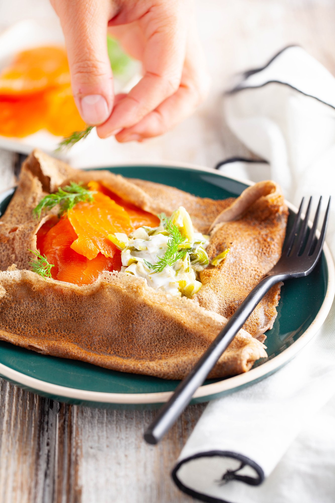Savourez cette délicieuse galette au sarrasin, délicatement garnie de poireaux fondants et de saumon fumé savoureux, une