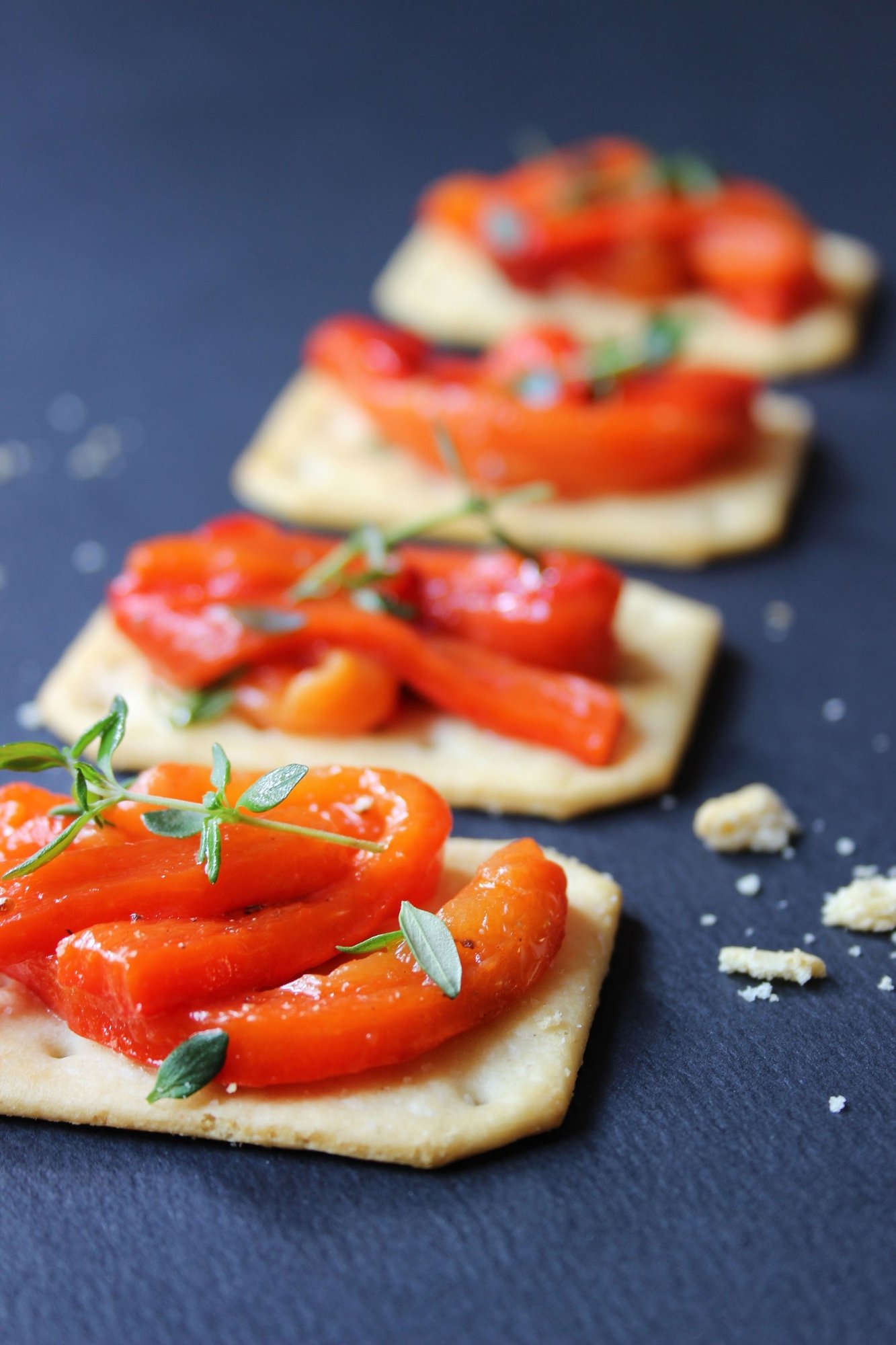 Savourez des toasts de poivrons marinés, une délicieuse combinaison de pain croustillant garni de poivrons colorés, marinés