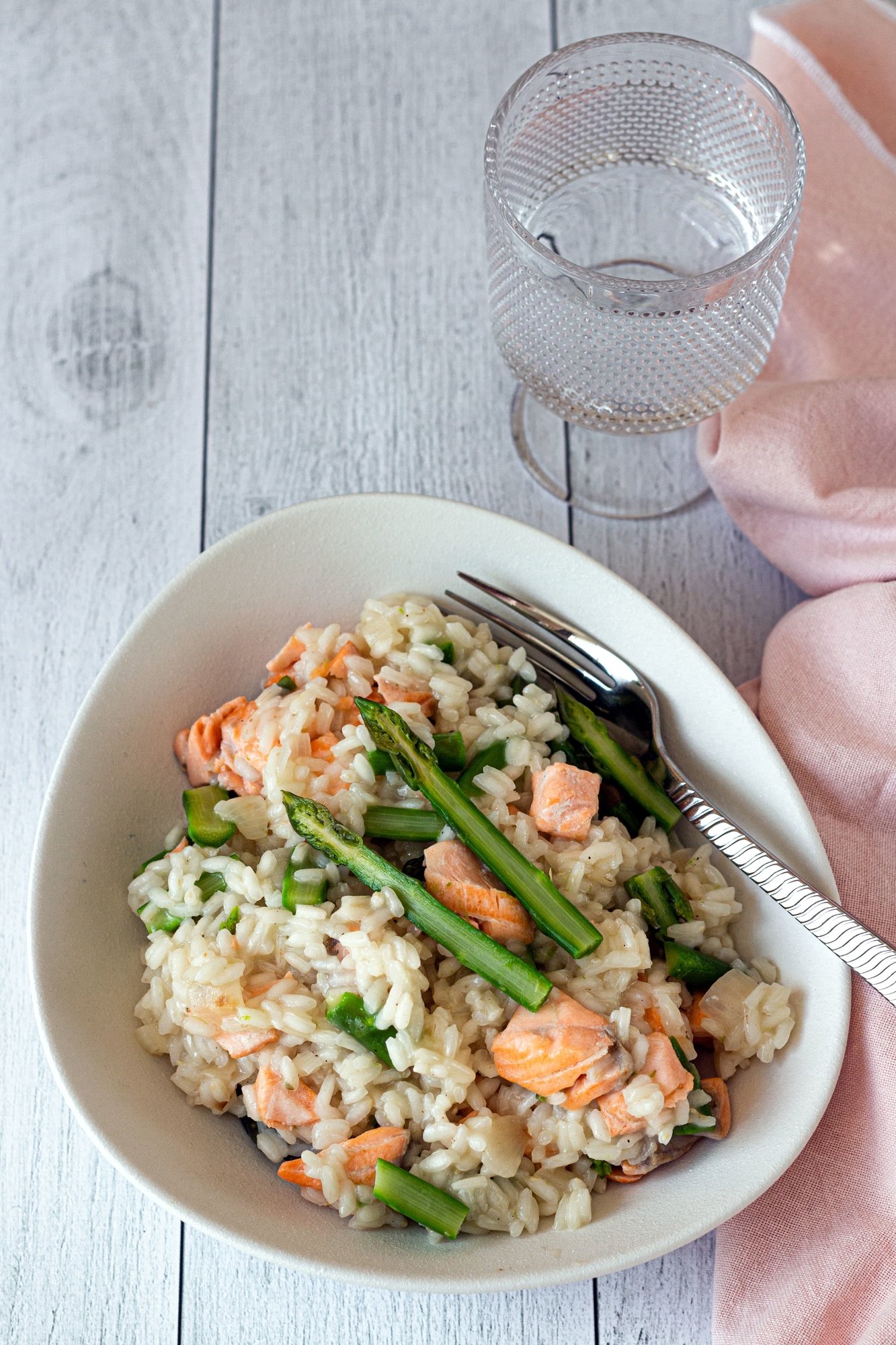 Savourez un délicieux riz aux asperges vertes et saumon, où chaque grain de riz s'imprègne des saveurs
