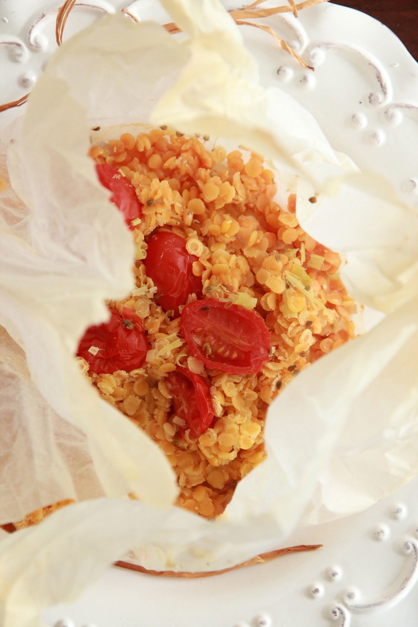 Savourez une explosion de saveurs avec notre papillote de lentilles corail au curry vert, un plat à