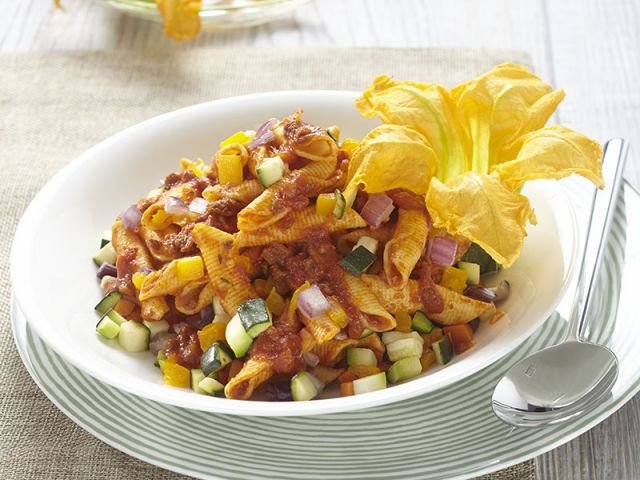 Découvrez le délice des garganelli à la sauce Bolognese, sublimés par des légumes croquants et des fleurs