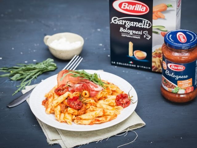Savourez des garganelli délicatement enrobés d'une sauce Bolognese riche et parfumée, rehaussés par des morceaux de speck