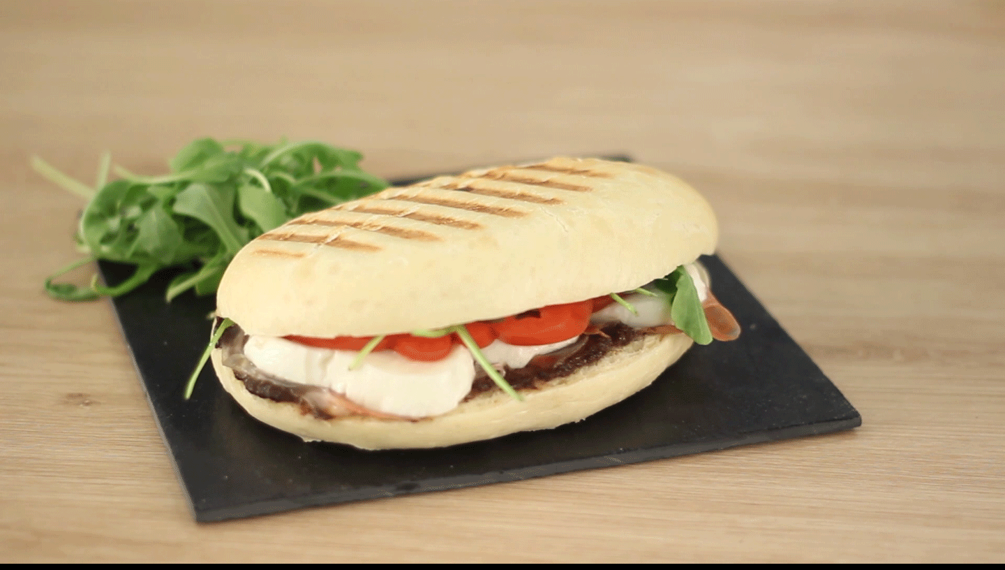Savourez un délicieux panini garni de jambon cru savoureux, de mozzarella fondante, de tomates juteuses et de