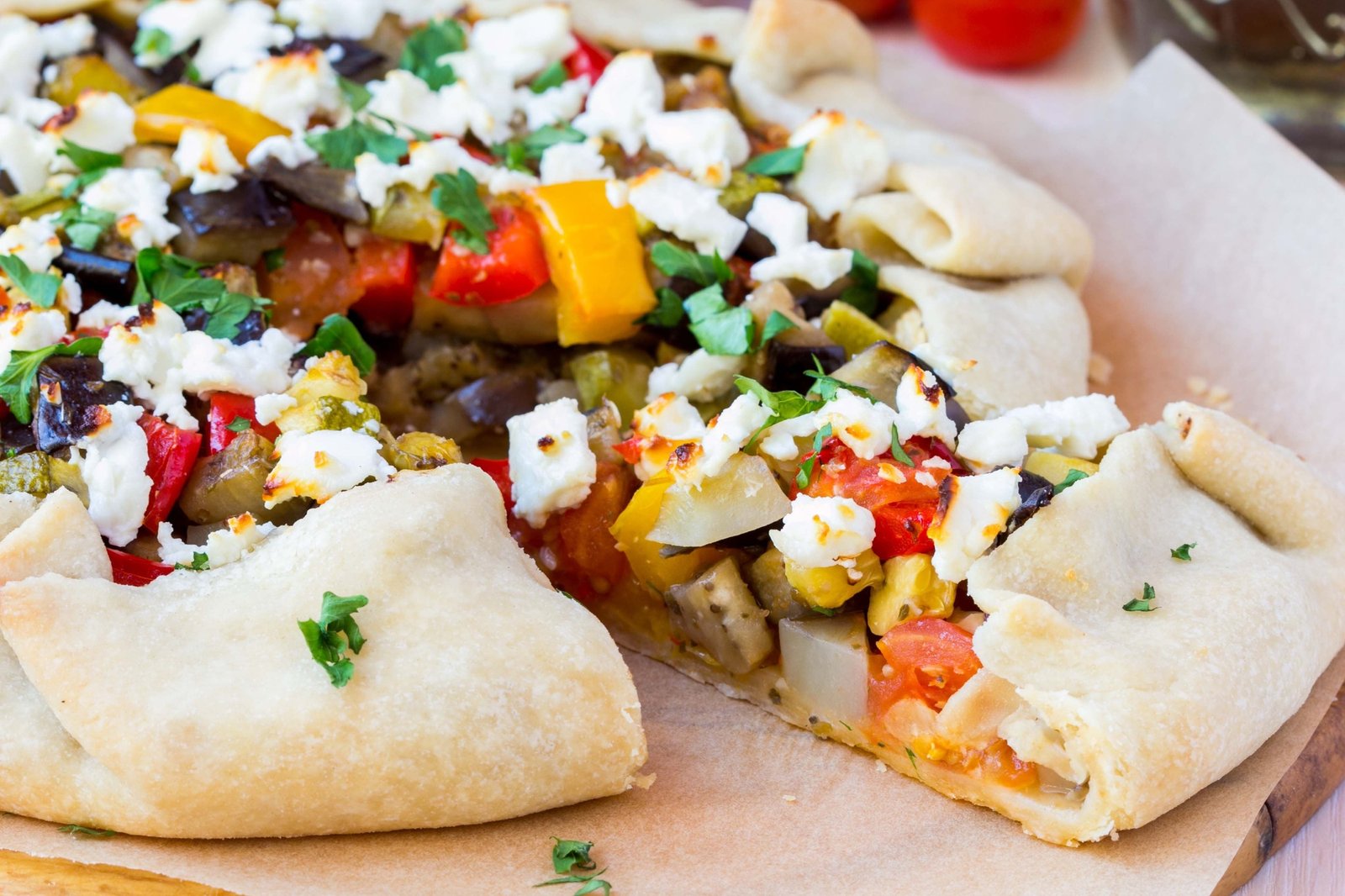 Succombez au charme de cette tarte rustique aux légumes du soleil et feta, où la pâte croustillante