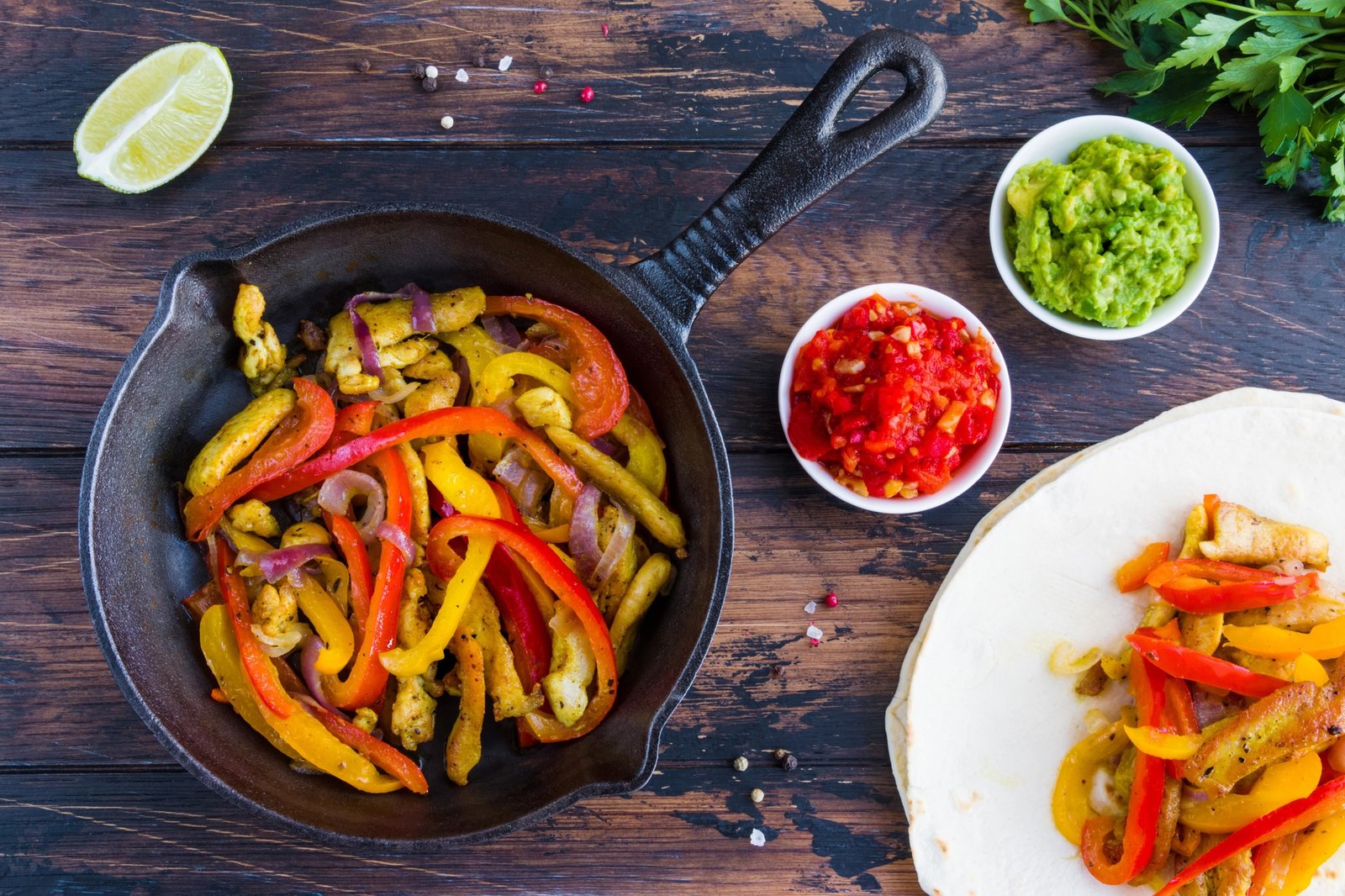 Savourez des Fajitas irrésistibles où des lanières de poulet ou de bœuf marinées dans des épices envoûtantes