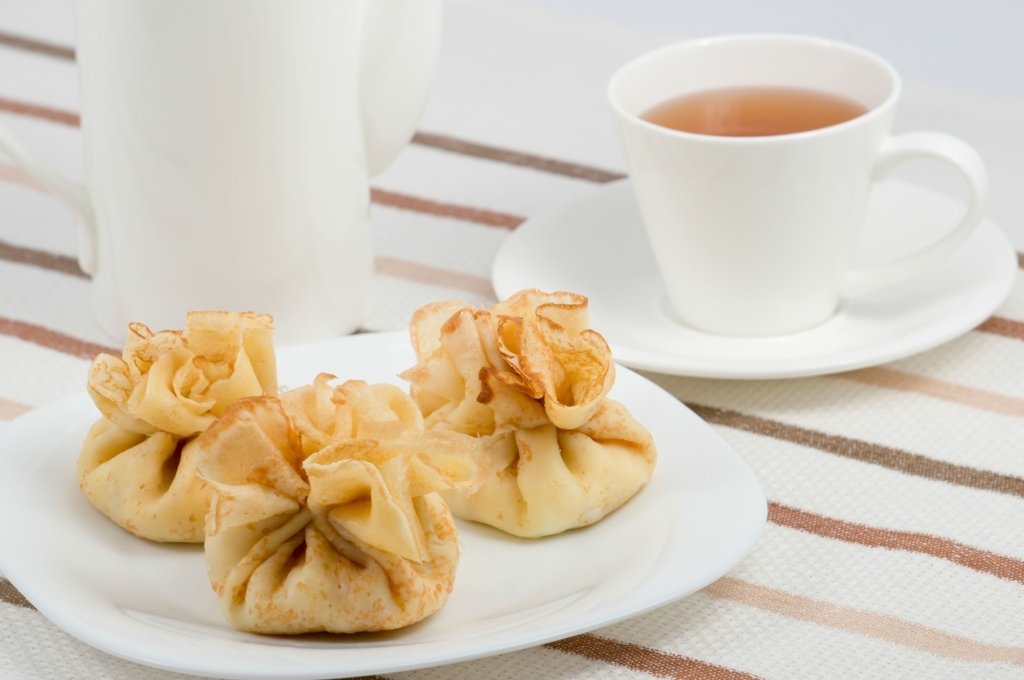 Refermez les crêpes en aumônières, en vous aidant de cure-dents ou de ficelle, et placez-les dans un plat allant au four.