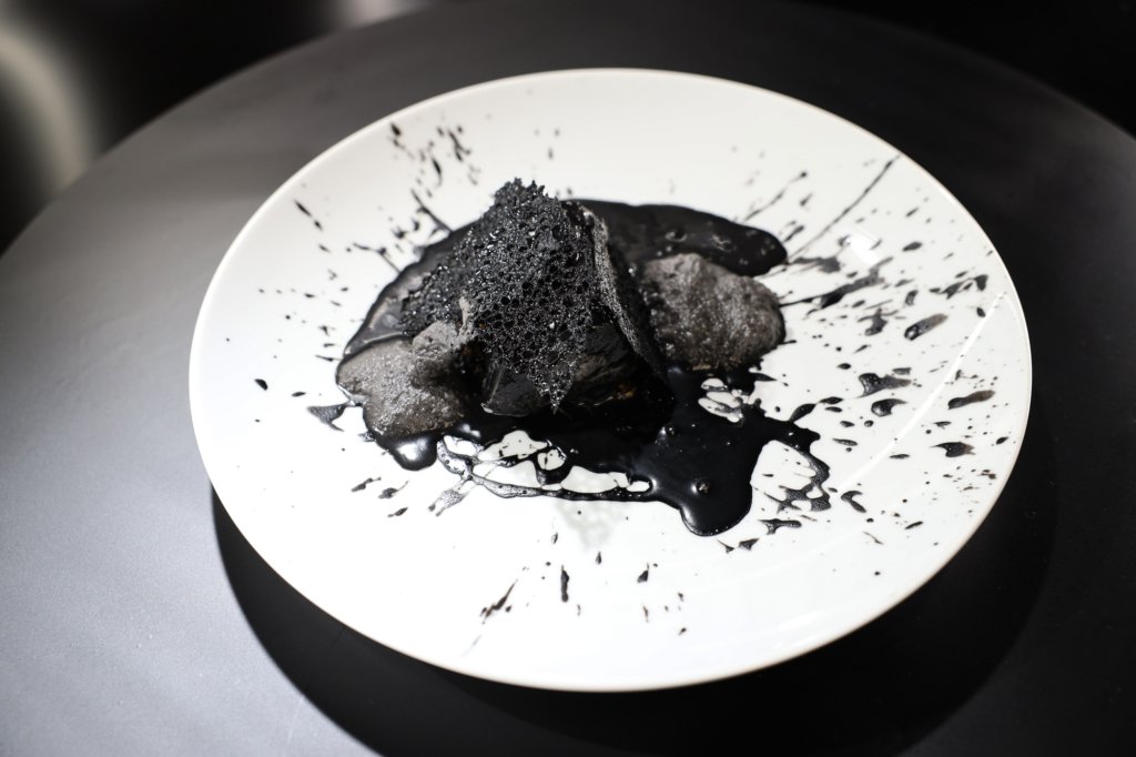 Dressage : Eclaboussez la sauce sur l’assiette. Cerclez le tartare que vous posez dessus. Mettez le cabillaud sur le tartare. Mettez des tuiles de charbon tout autour et l’écume noire où vous le souhaitez.