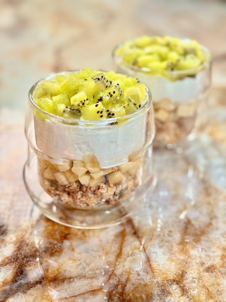 - Couleurs : Alternez les couches de cheesecake et de fruits en utilisant des verrines transparentes pour jouer avec les couleurs vives du kiwi et des bananes.