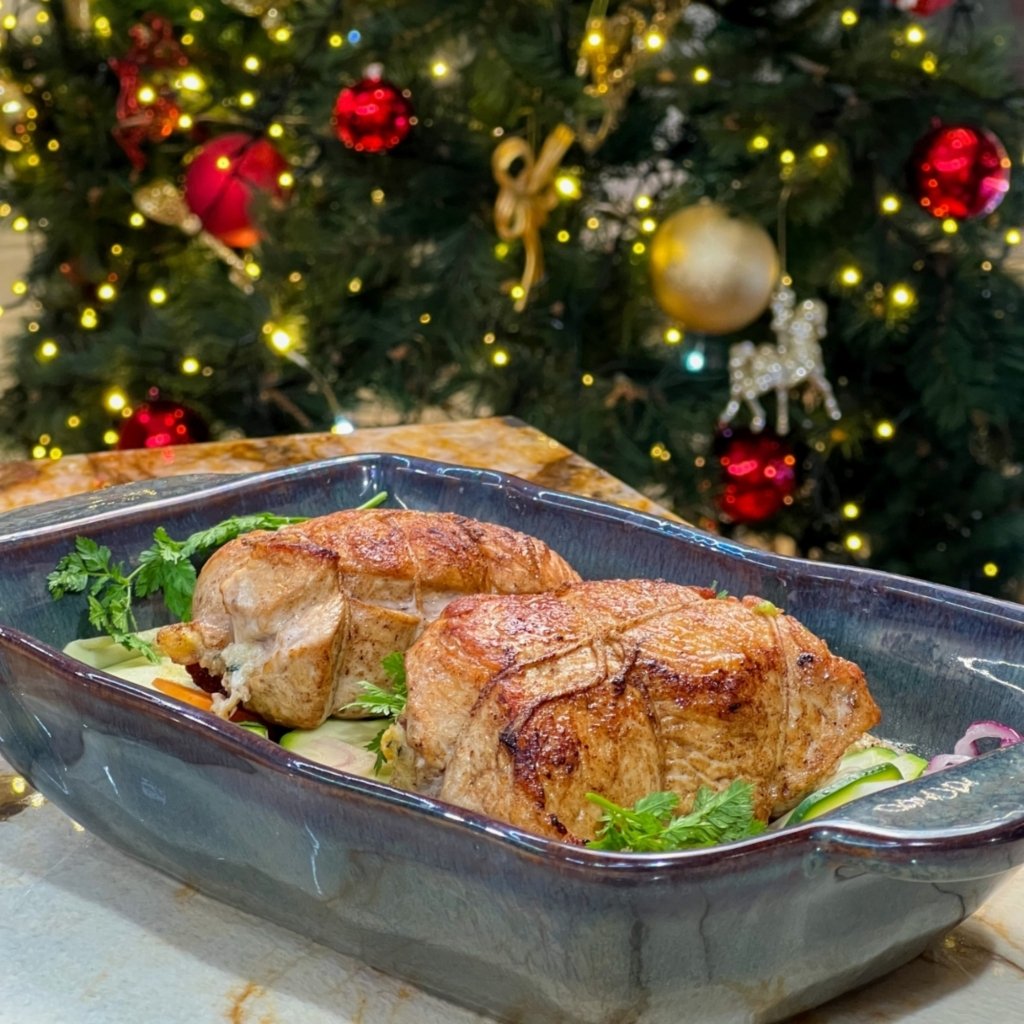 - Assiette colorée : Disposez la dinde farcie au centre de l’assiette et entourez-la de légumes grillés en créant une palette de couleurs vives.