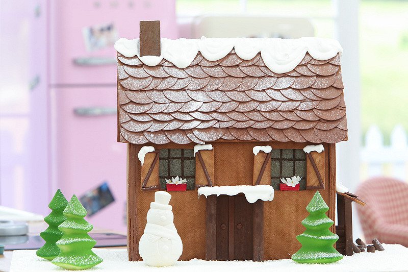 Décorez avec la « tuile » cristalline, cuite et mixée, pour réaliser les fenêtres ainsi que de la poudre vanille pour les barreaux.