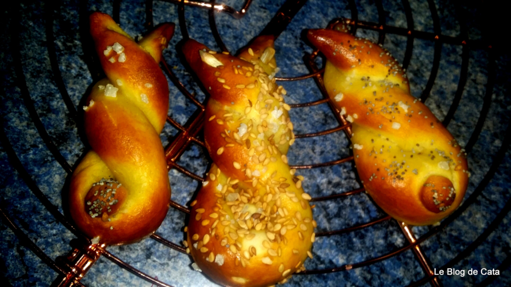 Déposez les lapins bretzels sur un papier sulfurisé beurré (ou sur une plaque beurrée). Parsemez les de gros sel puis selon votre convenance avec des graines de sésame, pavot, tournesol etc. Variez les saveurs pour un apéritif surprenant. Mettez au four pour 10 minutes maximum. Surveillez la cuisson. Lorsqu’ils sont bien colorés, sortez-les du four, et placez les placer une grille pour les laisser tiédir.