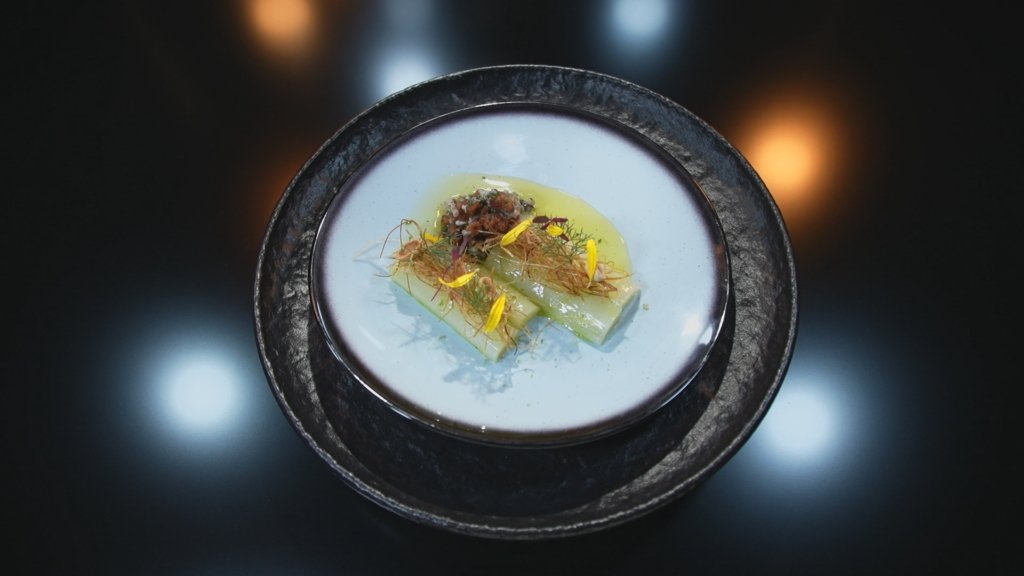 Poireau fondant : Taillez vos poireaux pour récupérer le blanc. Ensuite, placez-les dans une casserole d’eau bouillante, laissez cuire pendant 45 minutes. Une fois qu’ils sont cuits, mettez-les dans l’eau glacée pour stopper la cuisson et fixer la chlorophylle. Quand ils sont bien froids, égouttez-les et fumez-les à l’aide de sciure de bois. Cala va apporter un vrai goût fumé à la recette. Laissez les poireaux 10 minutes sous cloche pour que cela s’imprègne bien. Enlevez la première peau du poireau puis taillez-le en deux pour récupérer le cœur fondant du poireau. Étape 2