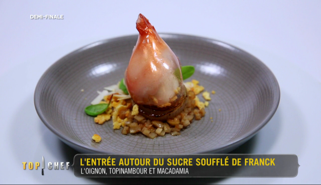 Déposez un emporte-pièce en fond d’assiette et remplissez-le de topinambour sauté aux noix de macadamia et 1 tranche d’oignon caramélisé au-dessus. Superposez ce montage de sucre soufflé en forme d’oignon et fourrez-le de mousse de topinambour. Dressez sur le côté 1 belle cuillère de crumble d’emmenthal et de râpée de noix de macadamia. Servez le jus en saucière.