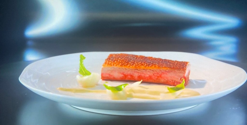 Dressage : Dessinez une larme de purée d’oignon dans le fond de l’assiette. Posez 3 pickles d’oignon et 3 chips de verveine dessus. Posez la poitrine de canard sur le côté. Versez le jus de réglisse dessus.