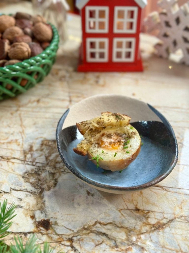 - Assiette plate : Disposez l’œuf au centre de l’assiette, l’oignon coupé en deux autour, et ajoutez un filet d’huile d’olive à la truffe pour un éclat supplémentaire.