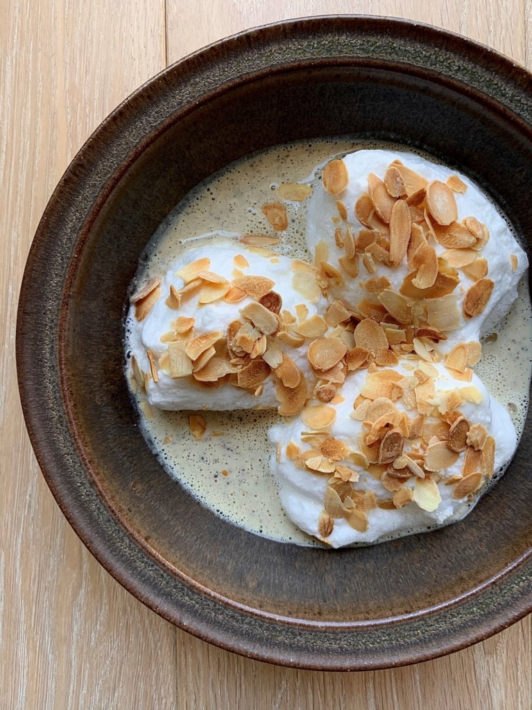 Versez la crème dans les assiettes. Déposez par dessus les blancs en neige puis parsemez d’amandes effilées toastées.