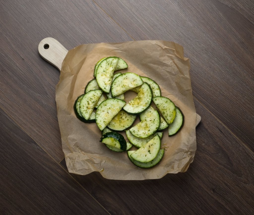 Fermez et malaxez pour bien enrober les courgettes, puis versez le tout sur le papier sulfurisé. Refermez le papier pour former une papillote hermétique, en repliant les extrémités sous la papillote ou en les attachant.