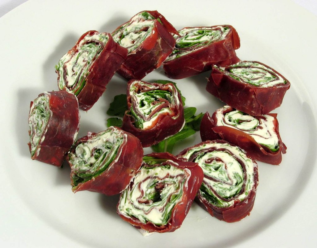Répéter l’opération avec le reste de bresaola, fromage à la crème et roquette, en calculant que chaque rouleau donne 2 portions. Étape 4