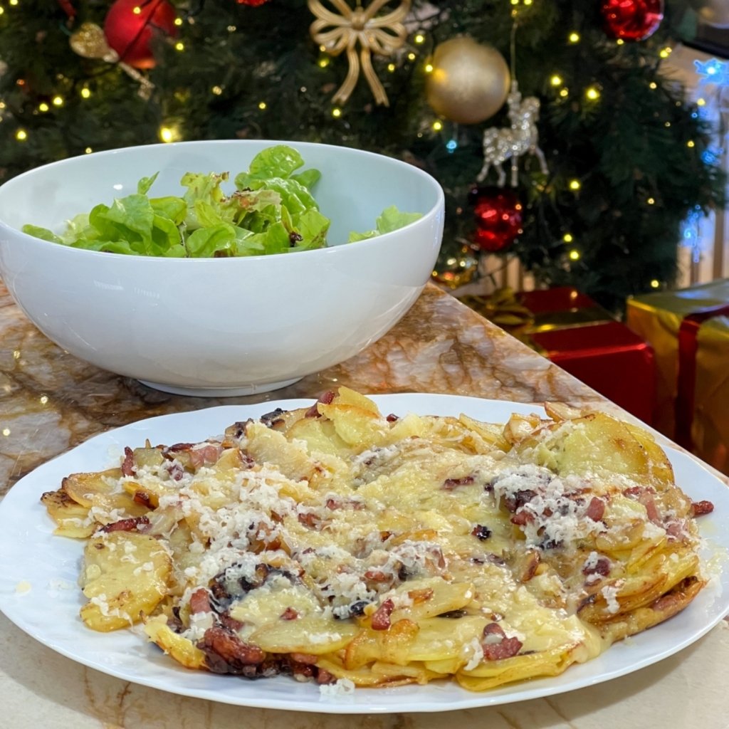 Dans une poêle chaude, déposer le gras de lard et un peu d’huile d’olive. Ajouter l’oignon émincé et le lard en bâtonnets, laisser cuire quelques minutes pour faire colorer. Dans une autre poêle, faire cuire les rondelles de pommes de terre, les faire rissoler. Rassembler le contenu des 2 poêles. Assaisonner de sel et poivre. Ajouter l’ail, continuer à cuire. Couper le fromage en dés puis l’ajouter, mélanger et déposer dans une assiette. Étape 2