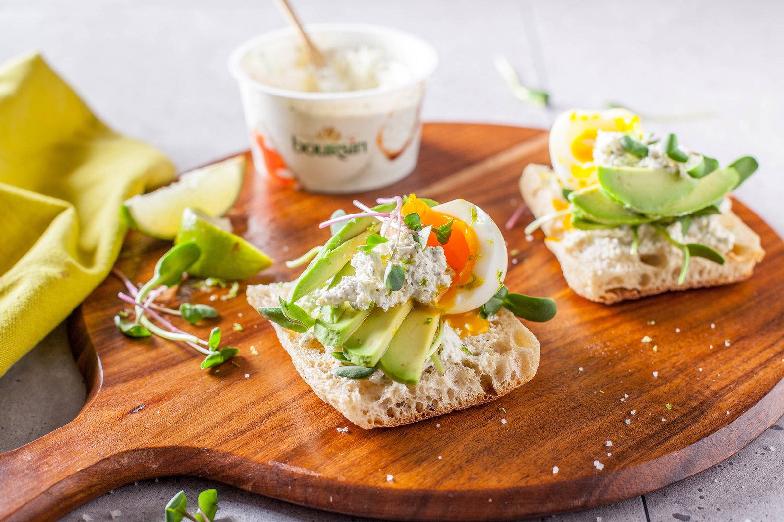 Savourez un délicieux avocado toast garni de Boursin Onctueux Ail & Fines Herbes, où la douceur crémeuse